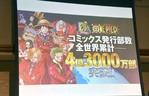 2015年に「最も多く発行された単一作者によるコミックシリーズ」としてギネス世界記録に認定され、2017年に連載開始から20周年を迎えた「ONE PIECE」。発表会に登場した週刊少年ジャンプ(集英社)の中野博之編集長は、国内で3億6000万部以上、海外で7000万部以上が発行されていることを説明し、「近い将来この4億3000万という数字を、現在のルフィの懸賞金額である5億に伸ばした形で皆様に報告できる日が来るのを確信しております」とコメントした。