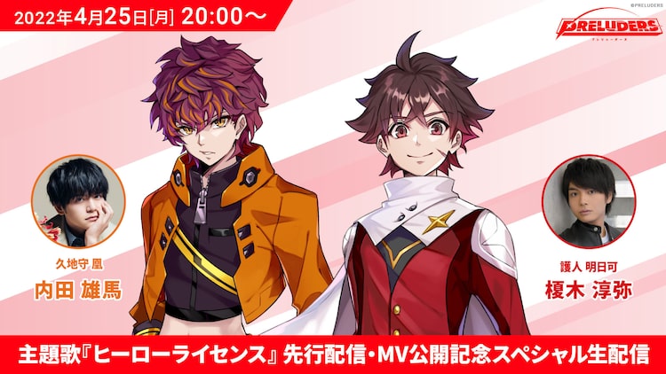 また先行配信とMV公開を記念して、榎木と内田による生配信イベントが決定。「PRELUDERS」の楽曲やMV、ボイスドラマの魅力や新たな情報について語られる。イベントは本日4月25日20時より、「PRELUDERS」YouTube公式チャンネルで配信。なおボイスドラマ第1章「因縁(Fate)」が収録された「ヒーローライセンス」のCDは5月18日に発売。CDでは、ディスコードで構成された謎の組織・Vice Versa(ヴァイスヴァ―サ)の天堂黎と倫の声優がお披露目されるため、気になる人はお見逃しなく。