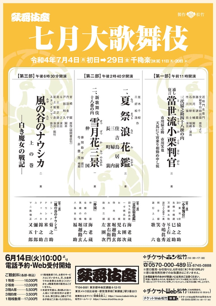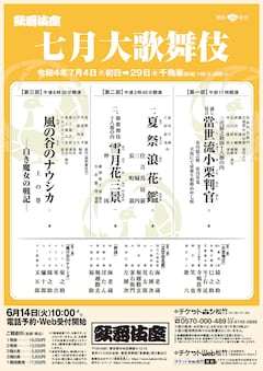 また第1部では市川猿之助らが出演する「三代猿之助四十八撰の内 通し狂言『當世流小栗判官』市川猿之助 市川笑也 天馬にて宙乗り相勤め申し候」、第2部には「夏祭浪花鑑 住吉鳥居前 三婦内 長町裏」「新歌舞伎十八番の内 雪月花三景 仲国」の2作がラインナップされた。チケット販売は6月14日10時に、チケットWeb松竹などで開始する。