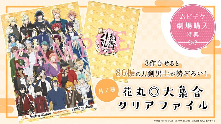 劇場購入特典として、「雪月華」3作合わせると86振の刀剣男士が勢揃いする「花丸◎大集合クリアファイル」をプレゼント。またムビチケオンライン券の購入特典は「特製スマホ壁紙」に決まった。さらにTOHO animation STOREおよびアニメイトでは「雪ノ巻」に引き続きバンドル付ムビチケ前売券を用意。TOHO animation STOREでは「ミニトング&マルチケース」、アニメイトではキャンバスボードが購入特典として進呈される。