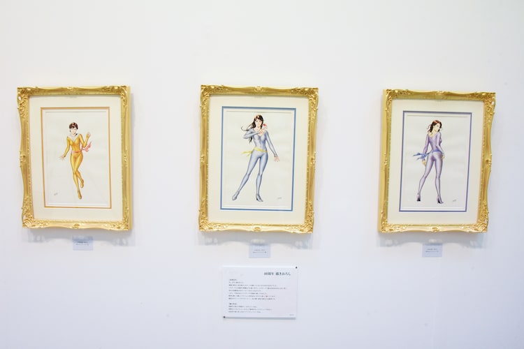 まず会場の入り口では、怪盗キャッツアイこと瞳、泪、愛の3姉妹のパネルが来場者たちをお出迎え。中に一歩入ると、北条が同展のために描き下ろした3姉妹のイラストが展示されている。イラスト近くには北条と「キャッツ♥アイ」の初代担当編集で現コアミックス代表取締役・堀江信彦氏によるコメントが。北条によると連載当時、3姉妹の衣装はレオタードではなく“泥棒用のボディースーツみたいなもの”として描いていたとのこと。今回はあえてレオタードの質感で描いてみたそうなので、その違いに注目だ。