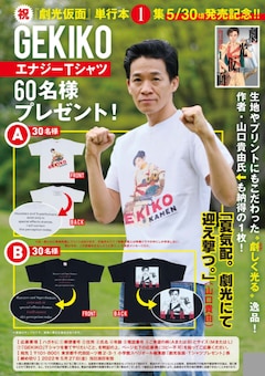 これは5月30日に「劇光仮面」1巻が発売されることを記念した企画。Tシャツは生地やプリントにもこだわり、作者の山口も納得の1枚だという。誌面には山口がTシャツを着る姿と「夏気配。劇光にて迎え撃つ。」というコメントが掲載された。Tシャツは白地と黒地の2種を用意。応募方法などの詳細は誌面をチェックしよう。