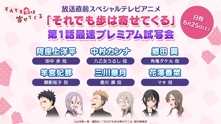 山本崇一朗原作によるTVアニメ「それでも歩は寄せてくる」の第1話最速試写会が、6月25日に都内某所で開催される。