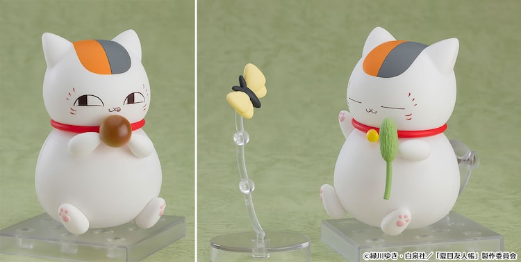 交換用表情パーツには「通常顔」「ペロリ顔」「のんびり顔」「怒り顔」の4種を用意。オプションパーツとして、ニャンコ先生の大好物である「饅頭」「エビフライ」「お酒〈猫ころし〉」のほか、「ぐい呑み」「ねこじゃらし」「ちょうちょ」が付属する。手足には磁石が内蔵されているため、フレキシブルな動きが可能。宴会を楽しんだり、蝶々と戯れたりするニャンコ先生の姿が楽しめる。