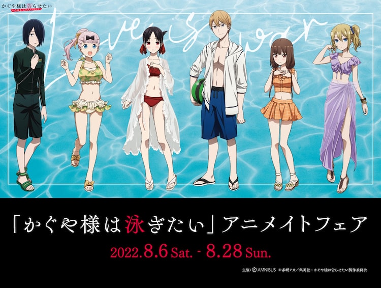 「『かぐや様は泳ぎたい』アニメイトフェア」と題されたこの企画では、水着姿のかぐやたちの描き下ろしイラストを使ったグッズを販売。缶バッジ、アクリルスタンド、クリアファイル、ボールペンなどがラインナップされた。これらのグッズは本日5月26日からアニメイト通販で予約を受け付け、またフェア開催後の8月29日より通販サイト・AMNIBUSでも販売。一部商品のボックス購入特典も用意され、アニメイトとAMNIBUSではそれぞれ特典のデザインが異なる。