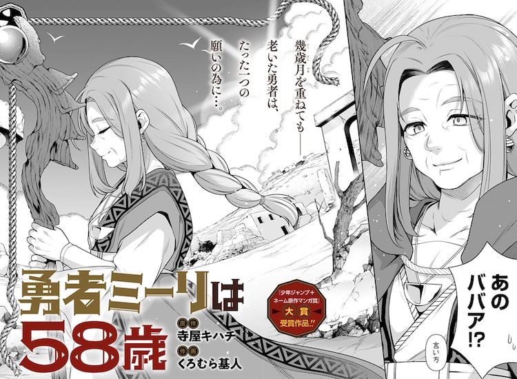 ジャンプ+のネーム原作マンガ賞で大賞受賞した、58歳の女勇者描くファンタジー 2022年6月2日2022年6月2日 editor 「勇者ミーリは58歳」扉ページ (c)寺屋キハチ・くろむら基人/集英社寺屋キハチ原作、くろむら基人作画による短編「勇者ミーリは58歳」が、本日6月2日に少年ジャンプ+で公開された。 同作は58歳のベテラン女勇者・ミーリを描くファンタジー。10代の頃から何度も魔王討伐の旅に出ているミーリは、魔王に対してとある感情を抱いていた。そんな彼女のこれまでの歩みが描写される。なお「勇者ミーリは58歳」は少年ジャンプ+の「ネーム原作マンガ賞」で、900本以上の応募の中から大賞に選ばれた作品だ。 関連記事「マクロス」シリーズ5作品が8月からディズニープラスで配信開始ひうらさとる初エッセイ刊行記念、4月19日に大阪の2カ所でトークイベント&サイン会「着せ恋」連載5周年を記念した展覧会が8月開催、福田晋一描き下ろしのビジュアル公開「響け!ユーフォニアム」劇場版全5作品を新宿でオールナイト上映、終了は翌朝8時頃「ゴールデンカムイ」全話無料公開、5月8日まで延長映画「さよならの朝に約束の花をかざろう」5周年記念、8日間限定で全国上映 Tweet