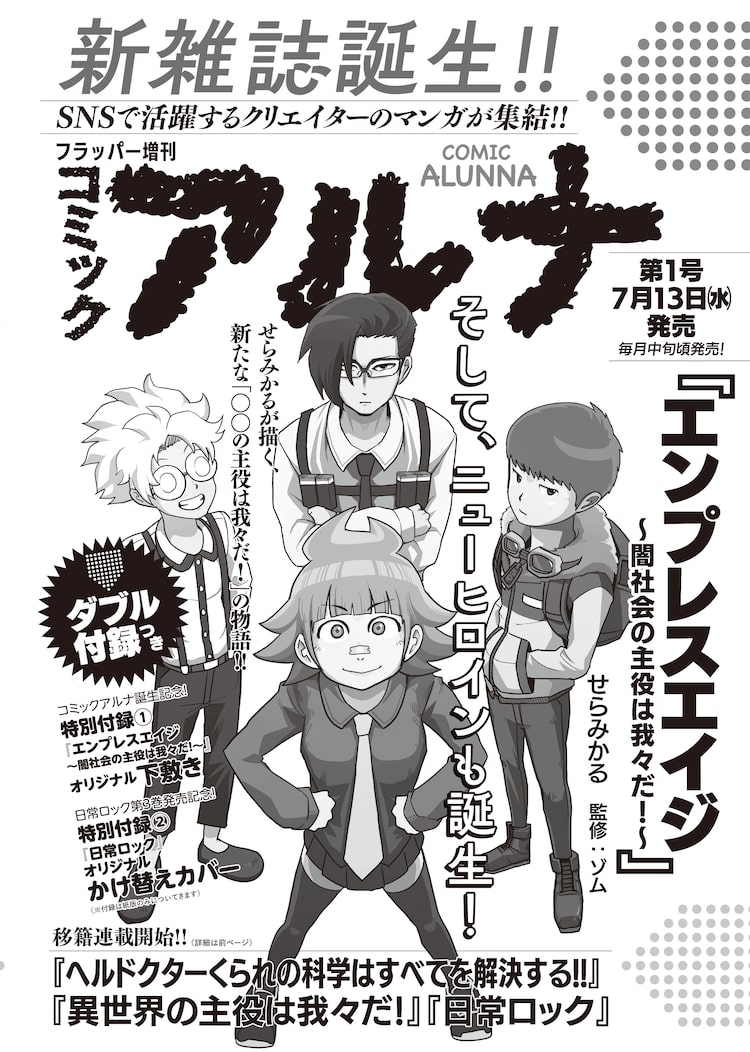 コミックアルナには、SNSで活躍するクリエイターや配信者といった、話題のインフルエンサーたちが登場するマンガが集結。フラッパーで連載されてきた「日常ロック」「異世界の主役は我々だ!」「ヘルドクターくられの科学はすべてを解決する!!」が移籍するほか、新たな「○○の主役は我々だ!」の物語として「エンプレスエイジ~闇社会の主役は我々だ!~」も幕を開ける。