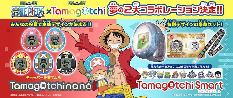 尾田栄一郎原作によるアニメ「ONE PIECE」と、携帯型育成玩具「たまごっち」シリーズがコラボレート。「Tamagotchi Smart」より「Tamagotchi Smartワンピーススペシャルセット」と「たまスマカード ワンピースフレンズ」が11月23日に、「Tamagotchi nano」より「チョッパーっち メモリアルカラー」と「チョッパーっち スペシャルカラー」が2023年2月25日に発売される。