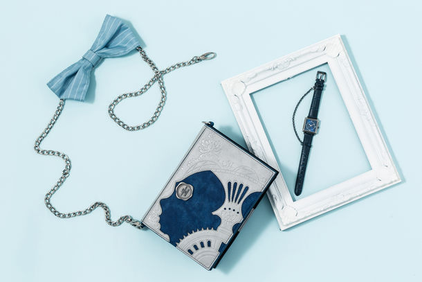 まるで古書のような個性的なデザインが魅力のミニショルダーバッグは、作品の世界観を表現したシックな一品。チェーンのショルダーストラップには大きめのリボンがあしらわれた。またチェーン付きの腕時計は、アクセサリー感覚で身につけられるスタイリッシュなアイテムに仕上がった。