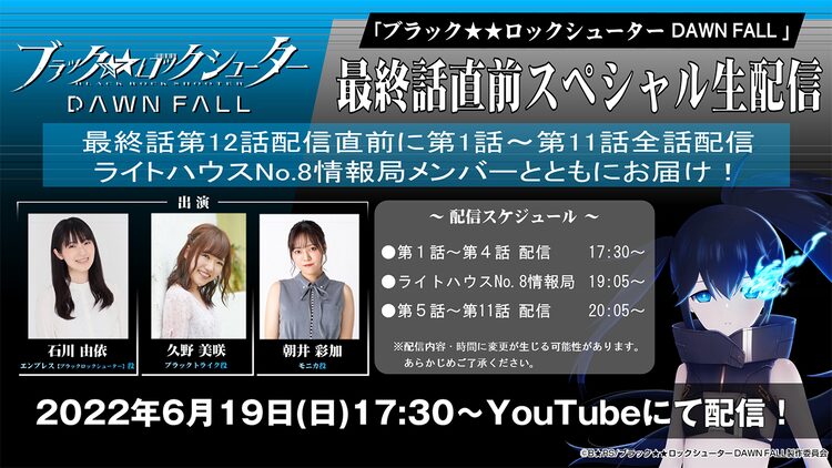 6月19日23時より、TOKYO MXほかで最終話の第12話が順次放送される「ブラック★★ロックシューター DAWN FALL」。一挙配信の途中には「ライトハウスNo.8情報局」が届けられ、エンプレス[ブラックロックシューター]役の石川由依、ブラックトライク役の久野美咲、モニカ役の朝井彩加が出演する。