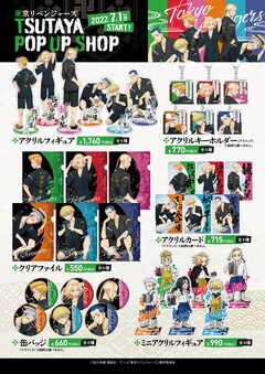 「TSUTAYA/東京リベンジャーズPOP UP SHOP~暑い夏を甚平で!!~」では、各キャラクターの甚平姿の描き下ろしイラストや、書店員姿の新規ミニキャライラストを使用したグッズを販売。ポップアップショップで対象のグッズを税込2200円以上購入すると、限定デザインのコレクターズカード全6種から1枚がプレゼントされる。さらに7月1日から17日まで、TSUTAYAオンラインショッピングにて昨年販売された甚平を各サイズ20枚限定で受注販売。加えて場地と千冬の墨絵柄Tシャツの受注も再開する。