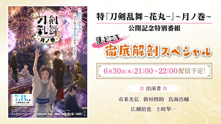 アニメ「特『刀剣乱舞-花丸-』~雪月華~」の第2幕「月ノ巻」の公開を記念した特別番組が、6月30日にTOHO animationのYouTube公式チャンネルで生配信される。