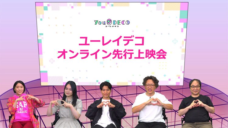 7月3日から放送される「ユーレイデコ」。現実とサイバースペースが重なり合う情報都市・トムソーヤ島を舞台に、その世界で生きるために必要不可欠な評価係数「らぶ」の消失事件の真相を巡って、少女ベリィ、天才ハッカー・ハック、そしてハックが率いるユーレイ探偵団による冒険が繰り広げられる。アニメの第1話から第3話までが配信されたこの日の上映会には、抽選で当選した約120人の視聴者が参加。制作過程やキャラクター、世界観、楽曲などについてトークが展開された。