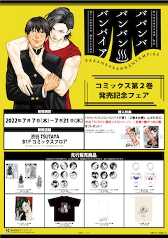 7月7日に発売される「ババンババンバンバンパイア」2巻。フェアでは単行本2巻までに収録されている名シーンを使用したアクリルスタンドや、作品の舞台である銭湯・こいの湯をイメージしたボディウォッシュタオルなど、全8種のアイテムが先行販売される。商品はマンガ・アニメ・ゲームグッズを専門とするセレクトECモール・A-AREAでも販売。また単行本1巻および2巻を購入した人には限定のイラストペーパーがプレゼントされる。
