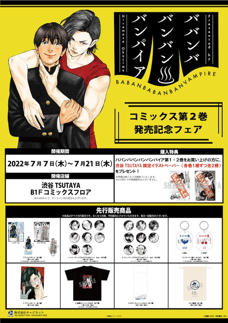 7月7日に発売される「ババンババンバンバンパイア」2巻。フェアでは単行本2巻までに収録されている名シーンを使用したアクリルスタンドや、作品の舞台である銭湯・こいの湯をイメージしたボディウォッシュタオルなど、全8種のアイテムが先行販売される。商品はマンガ・アニメ・ゲームグッズを専門とするセレクトECモール・A-AREAでも販売。また単行本1巻および2巻を購入した人には限定のイラストペーパーがプレゼントされる。
