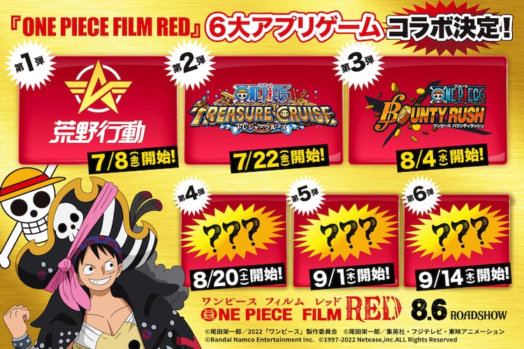コラボは映画公開の前後に3タイトルずつに分けて実施。前半には、7月8日開始の第1弾コラボ「荒野行動」、7月22日開始の第2弾コラボ「ONE PIECE トレジャークルーズ」、8月4日開始の第3弾「ONE PIECE バウンティラッシュ」がラインナップされた。それぞれのタイトルで、映画コラボステージやクエスト、限定キャラクターなどが期間限定で登場する。なお後半のコラボタイトルは追って発表に。第4弾は8月20日から31日、第5弾は9月1日から12日、第6弾は9月14日から25日にコラボが開催される。
