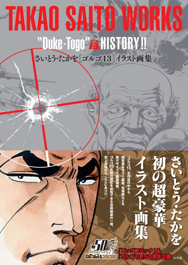 さいとう初のイラスト画集となる本書は、ビッグコミック(小学館)と「ゴルゴ13」の50周年を記念したもの。「ゴルゴ13」の全作品の中から貴重なカラー画稿や名場面などを厳選し、原画サイズで掲載。隅に書かれたメモや画稿の汚れまでも忠実に再現し、執筆時の緊張感と迫力がダイレクトに伝わってくる。さらにさいとう自身による解説も収められ、イラストとともに「ゴルゴ」の50年間を総覧できる一冊に仕上がった。