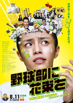 「野球部に花束を」は中学時代の野球部生活に別れを告げ高校デビューを目指すも、ひょんなことから再び野球部に入ることになった主人公・黒田鉄平の日常を描いた物語。本ビジュアルには「世界はこれを青春と呼ぶんだぜ。」というキャッチコピーとともに、高嶋政宏演じる圧倒的暴君・原田監督、野球部の怖い先輩部員たち、黒羽麻璃央演じる桧垣ら野球部1年生が厳しい部活に励む様子、醍醐虎汰朗演じる黒田たちがちょこんと並んでお弁当を食べる姿など、高校球児の忙しい日常が、黒田の頭上に詰め込まれた。「野球部に花束を」は8月11日に公開される。