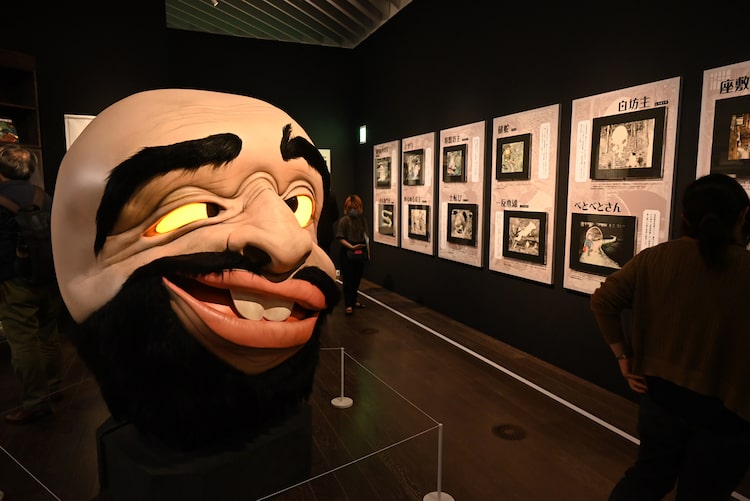 続く「第1章:水木しげるの妖怪人生」では水木の幼少期から彼が生死をさまよった従軍時代、貧困のマンガ家から一躍人気マンガ家となった軌跡をたどれる年表を配置。水木が作品を連載していた当時の週刊少年マガジン(講談社)や週刊少年サンデー(小学館)の展示のほか、瞬きをする塗壁とのフォトスポットも設けられた。暗幕を通り抜けると「第2章:古書店妖怪探訪」コーナーへ。鳥山石燕「画図百鬼夜行」や柳田國男「妖怪談義」といった、水木が所蔵していた民俗学や妖怪に関する資料が並べられ、水木の妖怪に対する探究心を垣間見ることができる。