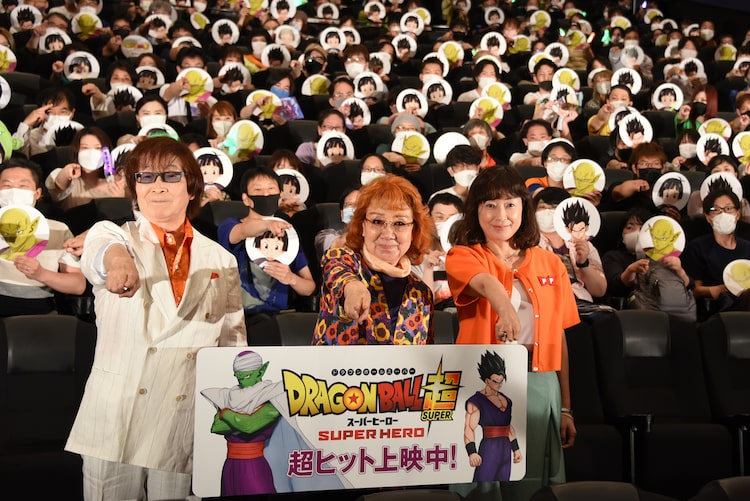 鳥山明原作による映画「ドラゴンボール超 スーパーヒーロー」の応援上映付き舞台挨拶が、本日7月9日に東京・新宿バルト9で開催され、孫悟空・孫悟飯・孫悟天役の野沢雅子、ピッコロ役の古川登志夫、ビーデル・パン役の皆口裕子が登壇した。なお本記事は映画のネタバレも含むため、これから鑑賞する人はご注意を。