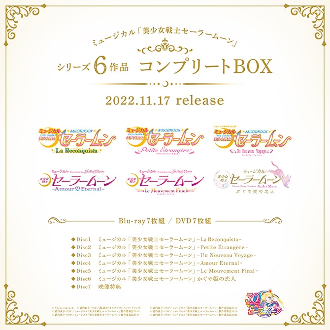 コンプリートBOXでは2013年公演の「〈-La Reconquista-〉」、2014年公演の「〈-Petite Étrangère-〉」、2015年公演の「〈-Un Nouveau Voyage-〉」、2016年公演の「〈-Amour Eternal-〉」、2017年公演の「〈-Le Mouvement Final-〉」、昨年2021年に上演された最新作「〈かぐや姫の恋人〉」までを網羅。コンプリートBOXは「美少女戦士セーラームーン」オフィシャルファンクラブの「Pretty Guardians」、ELR STORE(KING e-SHOP)、また11月に開催予定の「『美少女戦士セーラームーン』30周年記念 Musical Festival -Chronicle-」公演会場で販売される。価格はDVDが税込1万6500円、Blu-rayが税込1万7600円。
