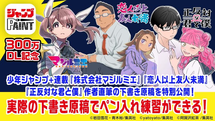 ジャンプPAINTは、PCやタブレット、スマートフォンでマンガが描けるペイントツール。公開された下書き原稿は岩田雪花原作・青木裕作画「株式会社マジルミエ」、yatoyato「恋人以上友人未満」、阿賀沢紅茶「正反対な君と僕」の3作品分で、ユーザーは下書き原稿を用いてペン入れの練習を行える。なおペン入れの練習をしている様子を撮影した動画も配信された。