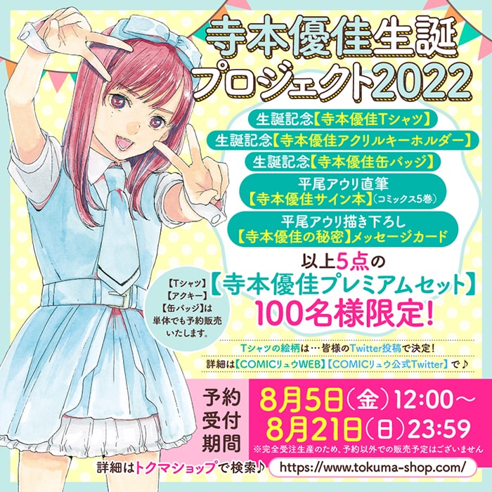 「寺本優佳生誕プロジェクト2022」グッズには、Tシャツ、アクリルキーホルダー、缶バッジをラインナップ。また平尾直筆の寺本優佳サインが入った単行本5巻を前述の3商品に加えた「寺本優佳プレミアムセット」も、先着100人限定で販売する。いずれも描き下ろしの「【寺本優佳の秘密】メッセージカード」付き。