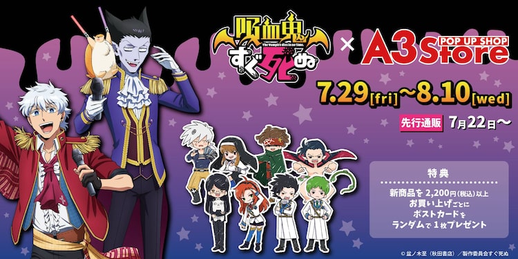 盆ノ木至原作によるTVアニメ「吸血鬼すぐ死ぬ」のポップアップショップが、本日7月29日から8月10日まで東京・P’PARCO内3階のA3 Storeで開催されている。