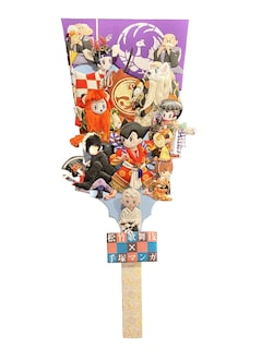 これは8月に手塚の「新選組」を原作とした歌舞伎作品が上演されることと、「鉄腕アトム」の連載70周年を記念したもの。歌舞伎座、松竹歌舞伎屋本舗では歌舞伎衣裳を身にまとった手塚マンガの登場人物のイラストを使用したグッズを販売する。また日本茶専門店・寿月堂でのコラボメニューの提供、東京・歌舞伎座ギャラリーにて東京歳之市羽子板商組合により制作された全長約2mの“コラボ特大羽子板”の展示などが行われる。