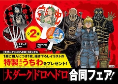ミニうちわのイラストは林田の描き下ろし。「大ダークVer.」と「ドロヘドロVer.」の2種類で、各作品に登場する店谷=ボックスとニカイドウが自身の店を宣伝しているように見えるデザインだ。フェア対象店舗はゲッサン(小学館)の公式サイトで確認を。なお8月10日発売のゲッサン9月号は「大ダーク」が表紙を飾り、付録として5巻のアナザーカバーが付属する。