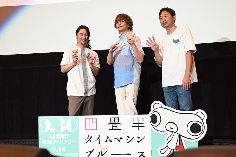 「四畳半タイムマシンブルース」は2010年にTVアニメ化された森見登美彦の小説「四畳半神話大系」と、上田誠による戯曲「サマータイムマシン・ブルース」とのコラボ小説が原作。本日8月12日は、作中で「私」たちがタイムマシンを見つけて乗り込んだ日となる。3人はそれぞれ劇中に登場するマスコット・もちぐまんをポケットに忍ばせて登場した。