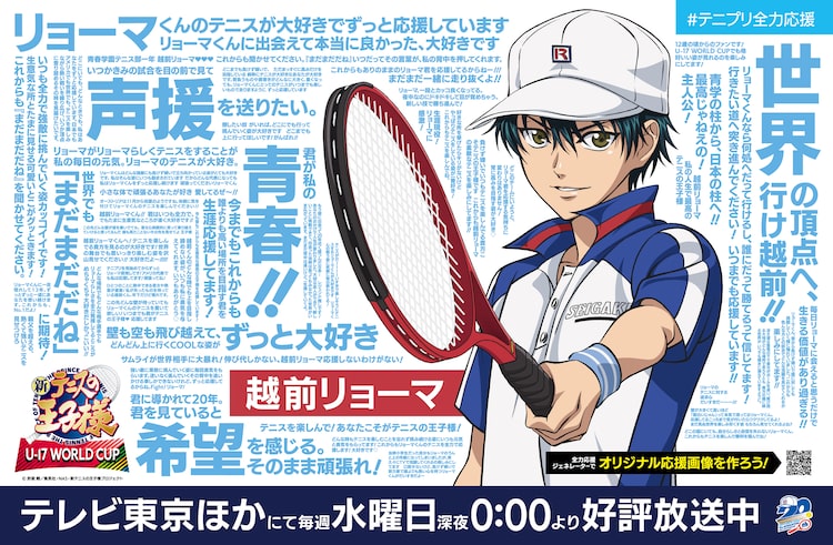 7月よりテレビ東京ほかで放送中の「新テニスの王子様 U-17 WORLD CUP」。広告には7月13日から21日までの期間に募集していたリョーマ、手塚、大石、不二、跡部、亜久津、幸村、真田、仁王、ブン太、切原、白石、銀、金太郎、木手への応援メッセージが使われている。