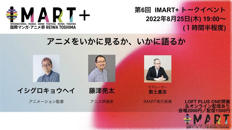 イシグロキョウヘイ、アニメ評論家の藤津亮太が登壇するトークイベント「IMART+」第6回「アニメをいかに見るか、いかに語るか」が、8月25日19時より東京・ロフトプラスワンで開催される。