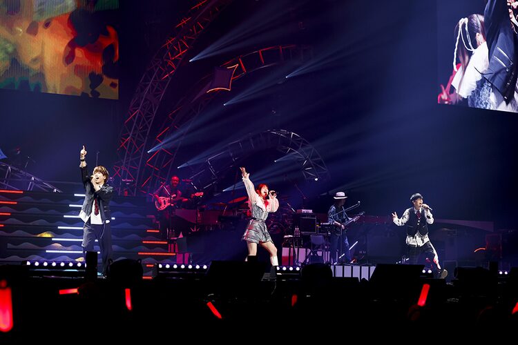 17年目を迎えた祭典のトップを飾ったのは、鈴木このみ、オーイシマサヨシ、仲村宗悟による「ウルトラギャラクシーファイト 運命の衝突」の主題歌「Now or Never!」。鈴木このみの伸びやかなボーカル、オーイシと仲村の息の合ったハーモニーを前に、会場は赤と白のウルトラマンカラーの灯りに包まれる。鈴木このみは「今日はアニソン界のヒーローたちがたくさん歌ってくれると思うので、最後までアニサマ、楽しんでいってね!」と呼びかけ、ステージを後にした。続く「IDOLY PRIDE」のステージでは、劇中のライブシーン映像を流しながらアニメの世界観を再現。バラードナンバー「song for you」も初披露され、長瀬琴乃役の橘美來が気持ちを込めてしっとりと歌い上げた。