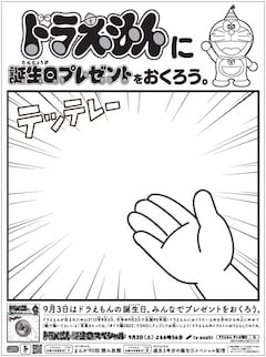 9月3日に誕生日を迎えるドラえもんのお祝い企画として、「ドラえもんに誕生日プレゼントをおくろう。」と題した広告が、本日8月30日の朝日新聞朝刊に掲載された。