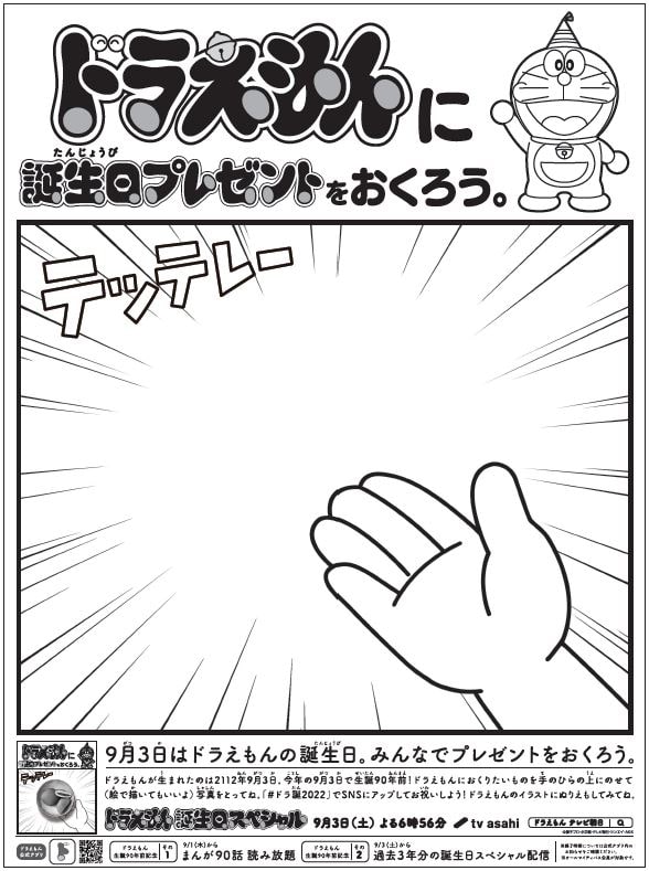 「ドラえもんに誕生日プレゼントをおくろう。」は、ドラえもんへのプレゼントを新聞広告の上に置くもしくは絵を描いて、その写真を「#ドラ誕2022」のタグをつけてSNSに投稿しようという企画。新聞広告は公式サイト「ドラえもんチャンネル」の特設ページからダウンロードすることもできる。