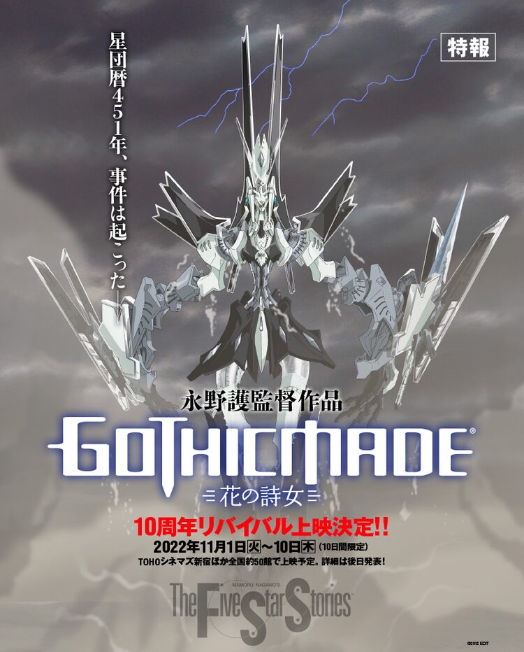 永野護監督によるアニメ映画「花の詩女 ゴティックメード」が、2012年の公開から今年で10周年を迎える。これを記念したリバイバル上映が開催されることが決定した。