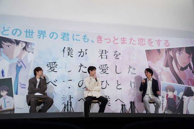 アニメ映画「僕が愛したすべての君へ」「君を愛したひとりの僕へ」の舞台挨拶が本日10月15日に東京・ 丸の内TOEIで行われ、両作の主人公・暦役の宮沢氷魚、「僕愛」の主題歌・挿入歌を担当した須田景凪、原作者の乙野四方字が登壇した。なお本記事にはネタバレが含まれるため、これから鑑賞予定の方はご注意を。