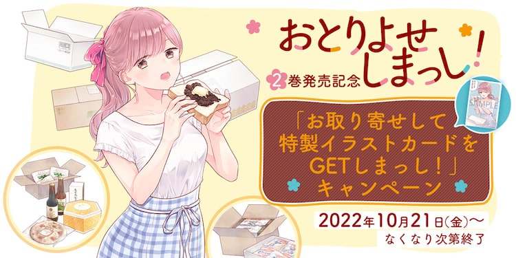 ちさこ「おとりよせしまっし!」2巻が本日10月21日に発売された。発売を記念して、作中に登場するグルメを“お取り寄せ”すると特製イラストカードがもらえるキャンペーンを展開している。