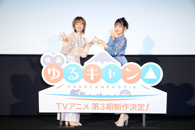 ここでシリーズの最新情報として、TVアニメ第3期の制作決定が発表されると、観客からどよめきと大きな拍手が起きる。東山とひとしきり大喜びした花守は「大人のなでしこを演じたので、(アニメ「ゆるキャン△」が)絶対終わっちゃうと思ってた!」と続編に安堵した様子。東山は「私たちも3期があると思って映画の収録をしたわけじゃないので、こうして続編が作られるということは映画を楽しんでいただいた皆様のおかげ」とよろこぶ。あfろのコメントが読み上げられたあと、土岐綾乃役の黒沢ともよのコメント映像も上映された。あfろのイラストにはアニメ第2期で登場した綾乃の姿も描かれていたことから、花守と東山は3期での綾乃の活躍に想像を膨らませていた。
