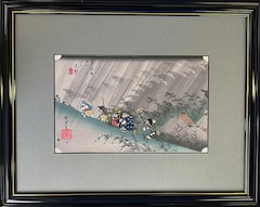 新作のモチーフは、歌川広重「東海道五拾三次之内」より、「東海道五拾三次之内 庄野 白雨」。駕籠かきと旅人に扮したドラえもんとのび太たちが、突然の夕立の中で坂を登るさまが描かれた。なお今回の商品には最高級の生漉奉書和紙が使用されている。