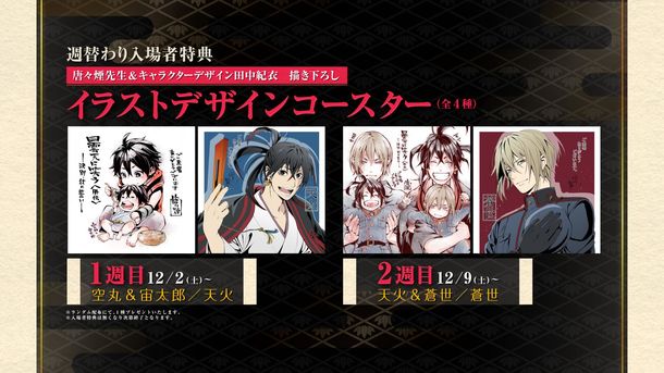 コースターにあしらわれたイラストは、原作者の唐々煙と、アニメでキャラクターデザインを務めた田中紀伊による描き下ろし。公開1週目、2週目と各週2種類がランダムで配布される。