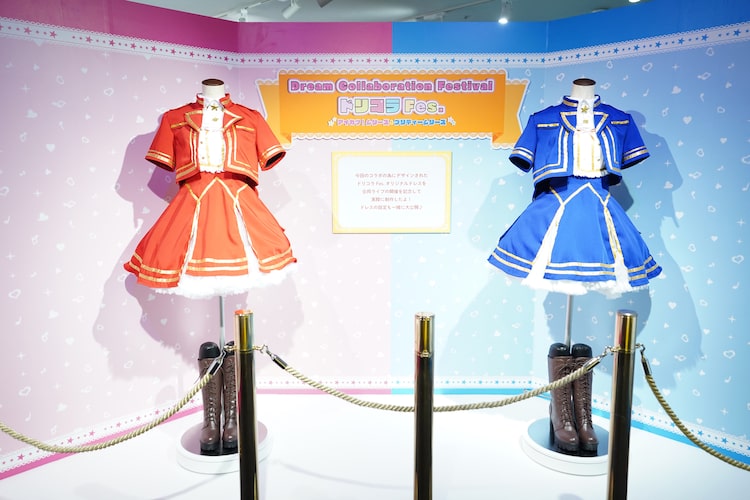 場内に設置された大型スクリーンには、両シリーズから14曲のライブ映像を順番に投影。さらに手持ちのスマートフォンを使って、スクリーン内に星や音符のマークなどを出現させ、映像を盛り上げることができる。また「アイカツプラネット!」と「プリパラ」のリアルライブで着用された衣装に加え、今回のコラボ用に描き下ろされたコラボドレスを実物大で再現。制作資料も合わせて展示されている。そのほか筐体に関しての展示物や、14人のアイドルが勢揃いのフォトスポット、さらに初代「アイカツ!」プロデューサーのバンダイ原田真史氏と「プリティーシリーズ」プロデューサーのタカラトミーアーツ大庭晋一郎氏の特別対談も掲出されている。