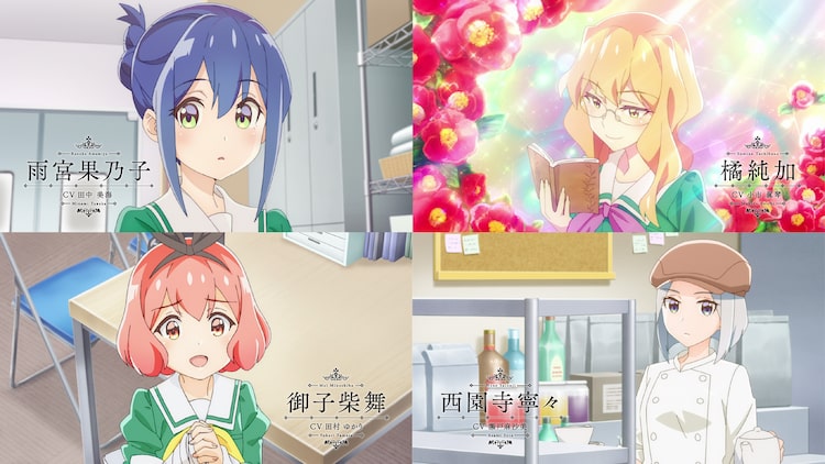 「私の百合はお仕事です!」は、「学園の生徒たちが来客者を相手に給仕する」というコンセプトのカフェ・リーベ女学園を舞台にした百合作品。リーベ女学園で働く雨宮果乃子役を田中美海、橘純加役を小市眞琴、御子柴舞役を田村ゆかり、西園寺寧々役を瀬戸麻沙美が演じる。