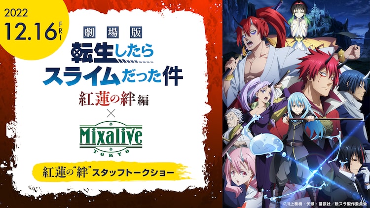 「劇場版 転スラ×Mixalive TOKYO 紅蓮の“絆”スタッフトークショー」には、劇場版の制作に携わったアニメーションプロデューサー・小菅秀徳、プロデューサー・杉本紳朗らが出演。本編の内容に踏み込んだトークや、当日だけの秘蔵コンテンツが届けられるほか、プレゼント抽選会、未公開資料の紹介なども行われる。また会場では、劇場版をイメージしたオリジナルドリンクを販売予定。チケットは、明日11月12日12時にローチケで販売開始される。劇場アニメ「劇場版 転生したらスライムだった件 紅蓮の絆編」は、11月25日に全国ロードショー。