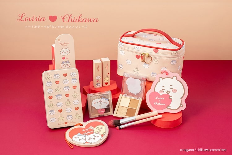 ちいかわの愛らしさを表現したハートがテーマの「Lovisiaちいかわコスメシリーズ」には、リップグロス、アイシャドウパレット、メイクブラシセットがラインナップ。それぞれちいかわ、ハチワレ、うさぎをデザインした4種類のパッケージが用意された。またLovisiaオンラインショップ限定で、バニティポーチ入りの「Lovisia限定コスメセット」4種と「Lovisiaちいかわラバーミラー」2種も販売される。