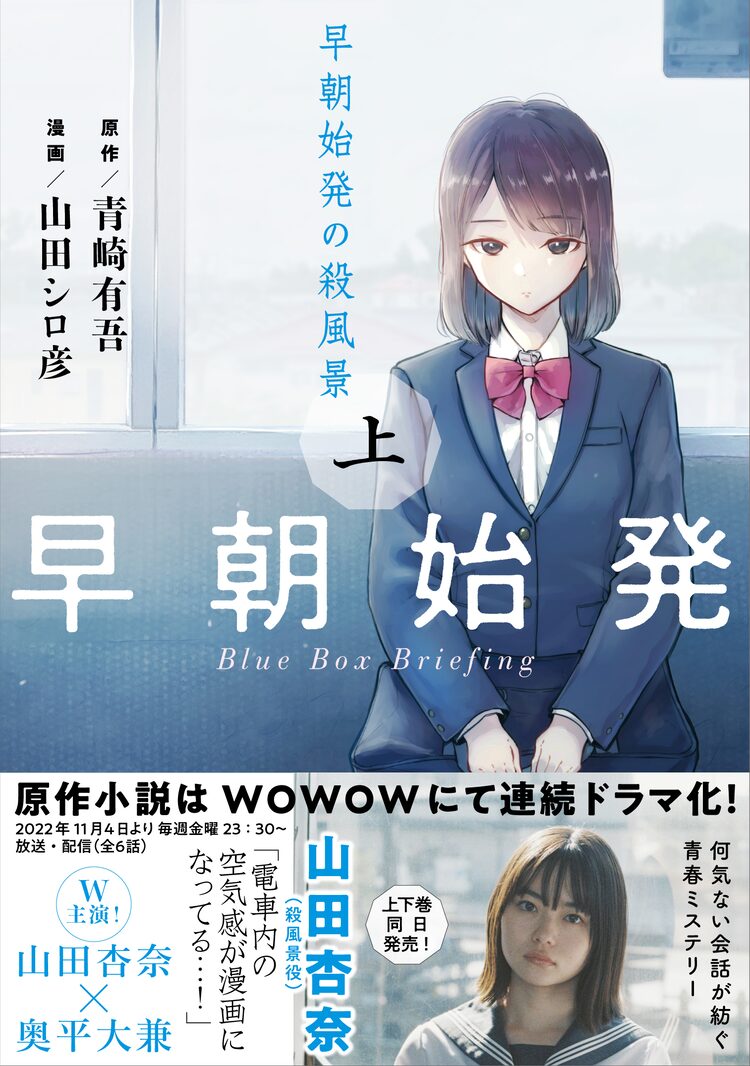 「早朝始発の殺風景」は山田杏奈、奥平大兼のW主演で連続ドラマ化も果たした青崎有吾による青春ミステリー小説のコミカライズ。気まずいシチュエーションの中に存在する小さな謎をめぐって物語が展開される。誰もいないはずの始発の電車で偶然遭遇したクラスメイトの男女、放課後のファミレスで学園祭のクラスTシャツのデザインについて意見を交わす少女たち、男同士で観覧車に乗ることになった先輩と後輩、捨て猫をめぐり喧嘩を繰り広げる兄妹、卒業式を休んだ女子のもとを訪れるクラス委員がそれぞれ織りなす5編のエピソードが上下巻に収録されており、下巻には描き下ろしのエピローグも収められた。