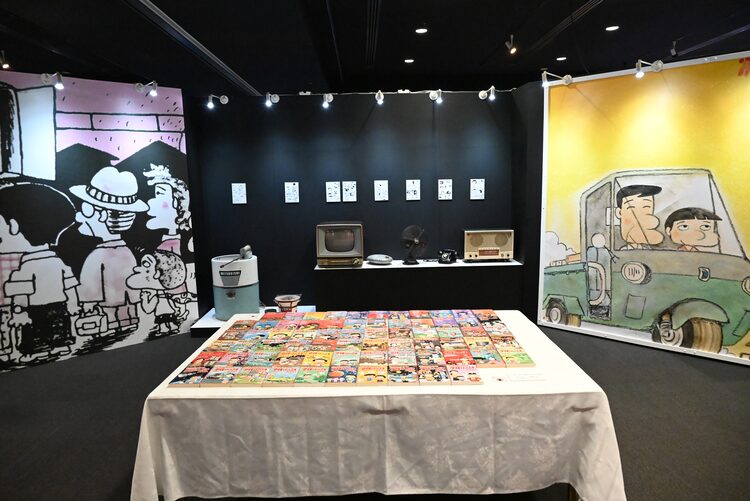 その先は、下書きと原稿、単行本のページを比較して鑑賞できる「三丁目の夕日ギャラリー」へ。壁は温かみのあるオレンジ色で、夕日町商店街の夕暮れどきの景色を思わせる。一部の壁には人々のイラストが描かれ、まるで自分が物語の中に入ったような気分に。またここにも攪拌式洗濯機やブラウン管テレビ、ダイヤル式黒電話など、「三丁目の夕日」の中で描かれたアイテムの実物が飾られた。