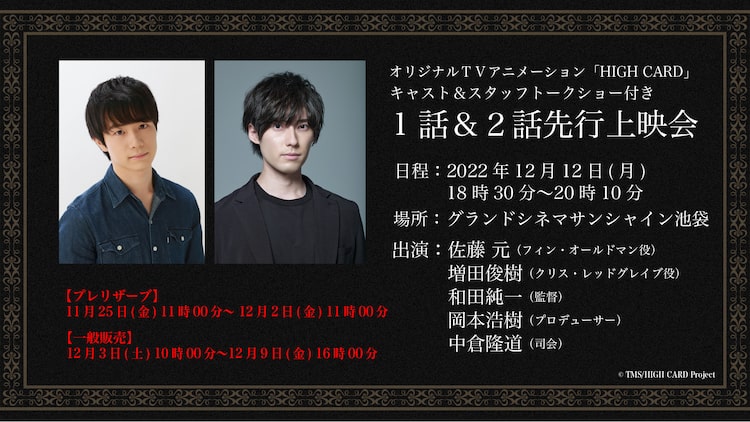 TVアニメ「HIGH CARD」の第1話と第2話の先行上映会が、12月12日に東京・グランドシネマサンシャイン池袋で開催される。
