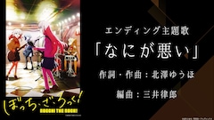 現在、TOKYO MXほかにて放送中の「ぼっち・ざ・ろっく!」。新たなエンディング楽曲となる「なにが悪い」は、作詞・作曲をthe peggiesの北澤ゆうほが手がけ、ボーカルは鈴代紗弓演じる伊地知虹夏が担当した。楽曲は各プラットフォームで配信中。北澤からのコメントも到着した。第8話の劇中曲「あのバンド」の配信もスタートしたほか、リリックビデオと劇中ライブ映像も公開。「あのバンド」には作詞で樋口愛、作曲で草野華余子、編曲で三井律郎が参加している。